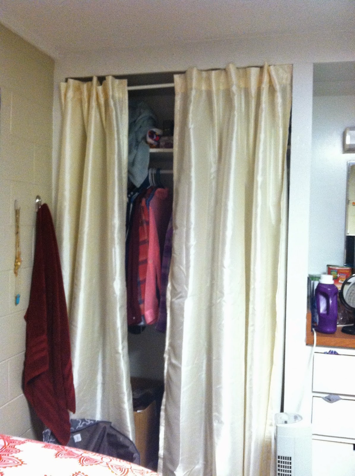 We bought up tension rods in all of our windows in closets to add color to the room while also giving the room a cleaner look. I highly recommend doing this because it really adds a lot to the space.